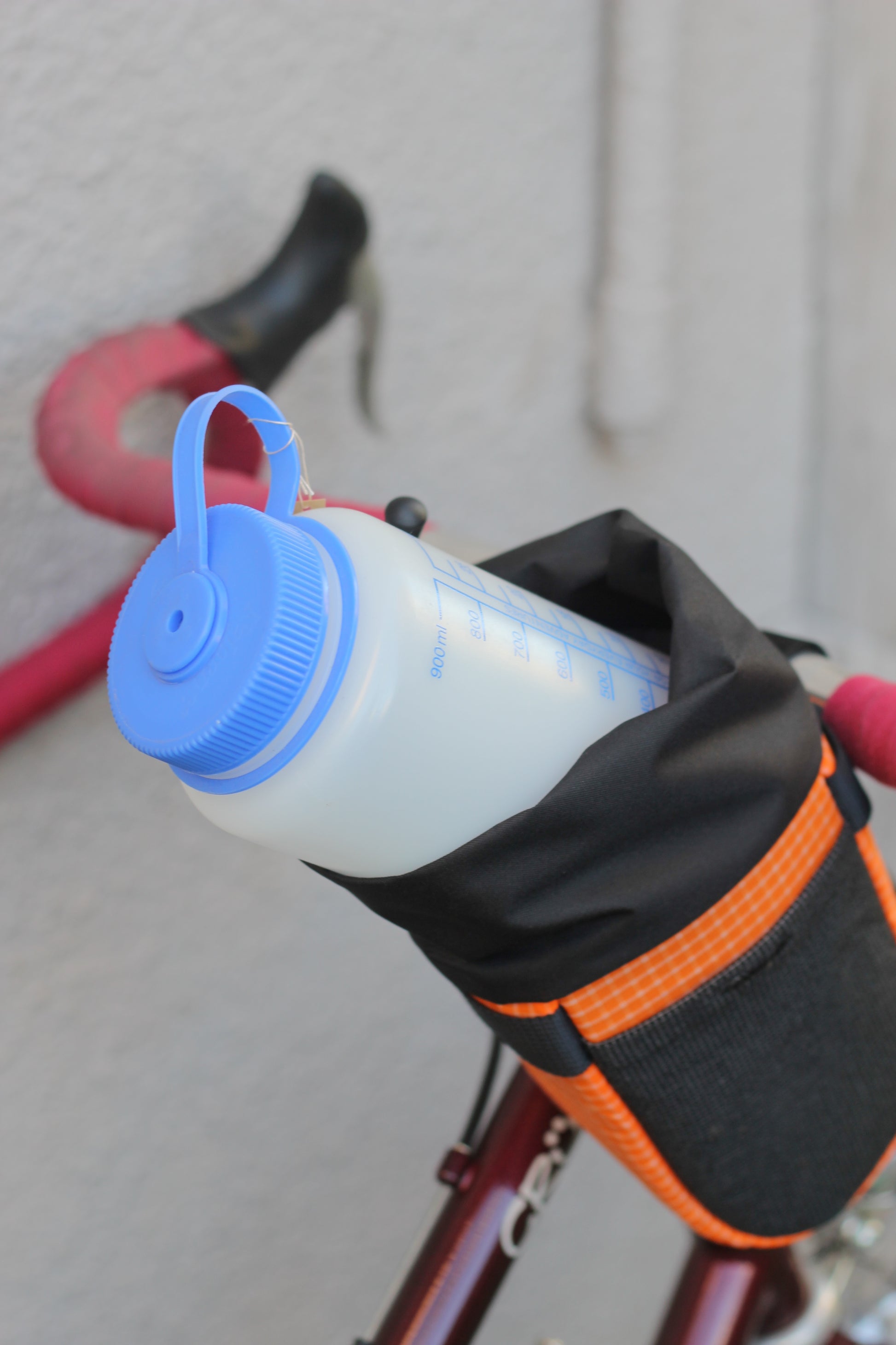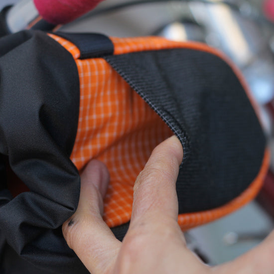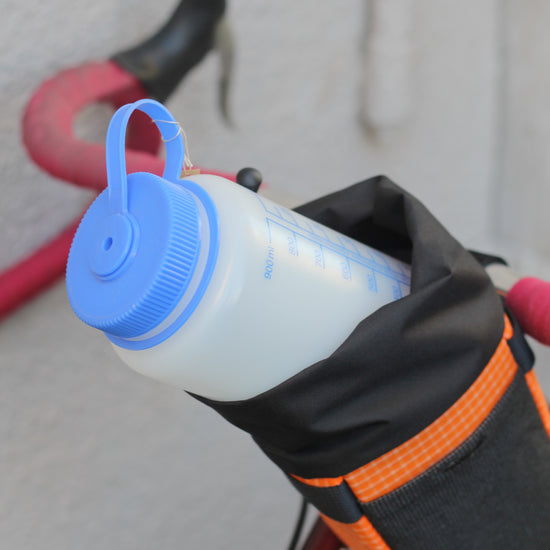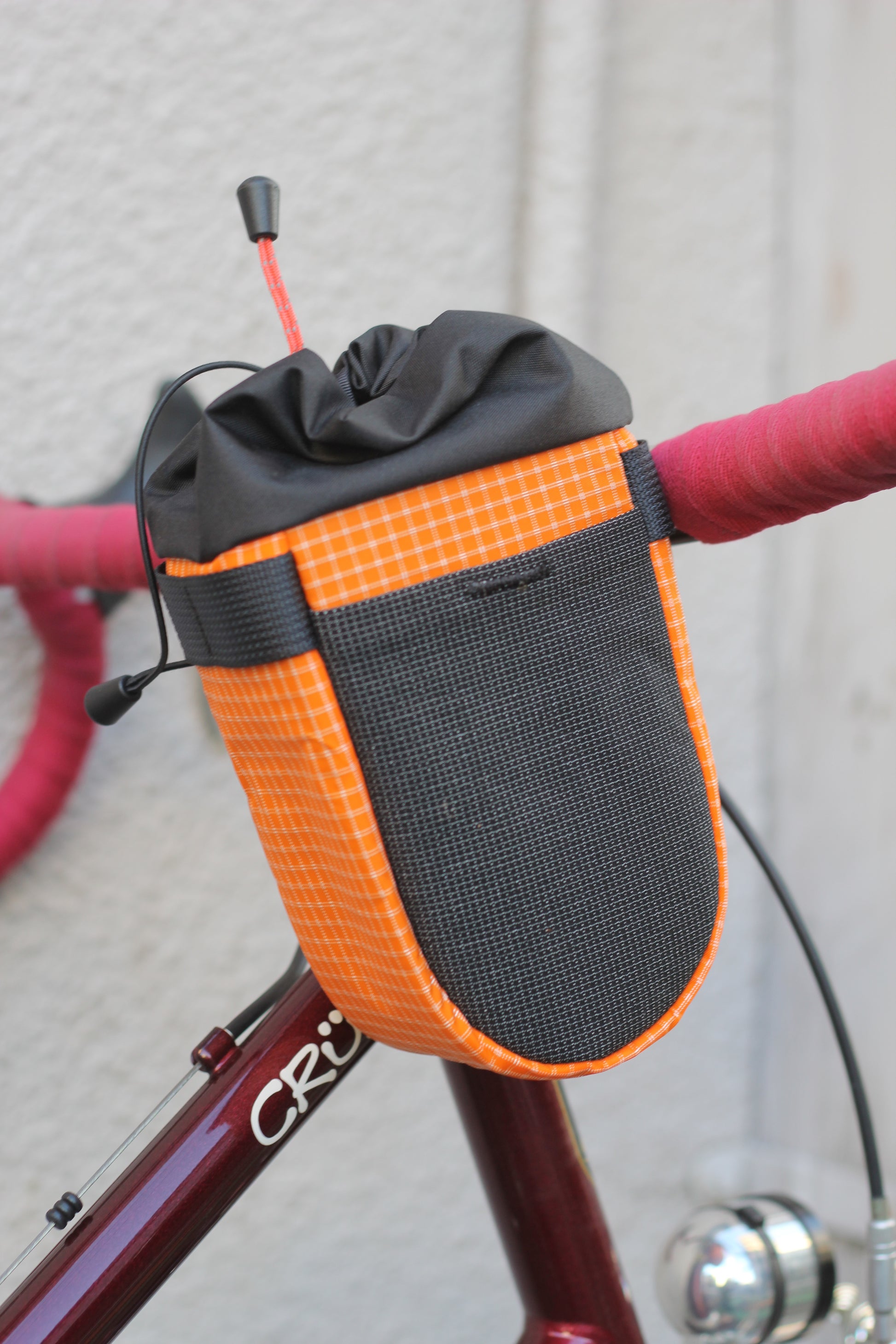 取り付け方法は付属の 2 つのベルクロストラップを使用して、"Muncher"をハンドルとステムに取り付けます。伸縮性のあるコードをバッグ下の小さなループに通し、コラムやヘッドチューブに取り付けます。